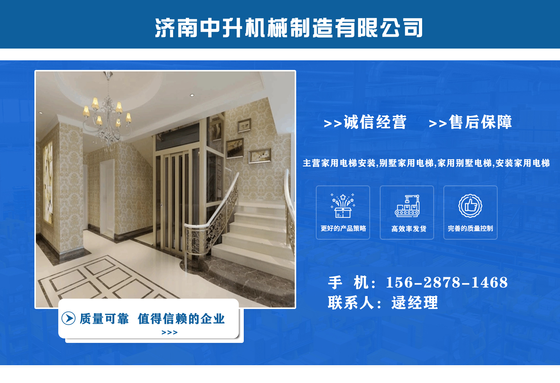 濟南中升機械制造有限公司主營家用電梯安裝,別墅家用電梯,家用別墅電梯,安裝家用電梯等業務,質量可靠,值得信賴!  公司為客戶提供免費上門測量,根據實際情況1對1服務,保障符合用戶需求,終身提供售后服務,讓用戶買的舒心用的放心。匠心團隊,打造信賴產品,我們有團結、奮進拼搏的匠心團隊,為您提供可信賴的品質保證?! 膭摿⒁詠硪恢眹栏駡绦匈|量管理體系、環境管理體系等相關標準管理體系,“顧客滿意”是我們始終如一的追求。我們有屬于自己培養的安裝隊伍,24小時服務電話,為您提供可靠的服務與支持?! ∥覀兊脑妇笆墙ㄔO國內具有影響力的電梯公司,做城市美好空間的好伙伴。...
